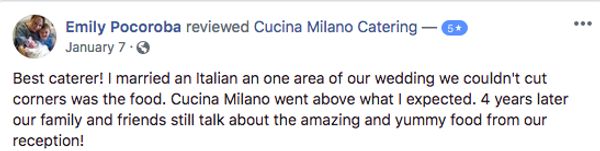 Best Caterer!... Cucina Milano went above what I expected. 4 years later our family and friends still talk about the amazing and yummy food from our reception. Catering in Flowery Branch and Braselton. We want you to feel like a guest at your special event.