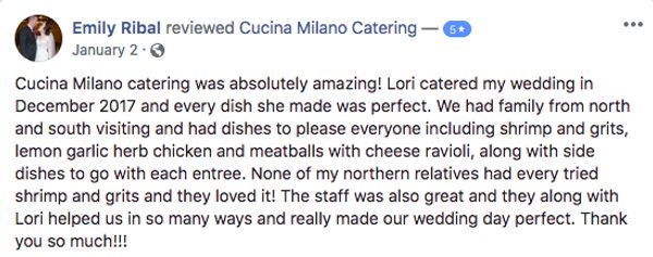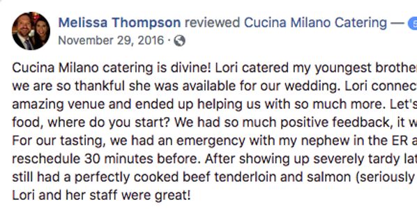 Cucina Milano Catering was absolutely amazing! Lori Helped us in so many ways and really made our wedding day perfect.